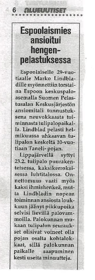 Tällä tarinalla oli jo vuonna 1996 onnellinen loppu, ja hyvä niin. Marko auttoi silloin siviilinä, ja pelasti pienen pojan hengen. Aina ei pelastajalla ole sitä paksua nahkatakkia (tai sammutustakkia!) mukana tai päällä, ja pelastajasta ei saa tulla pelastettavaa. Mutta aina on velvollisuus auttaa, jos siihen vaan on tilaisuus ja mahdollisuus, ja tarinoilla voi olla myös tämän tarinan kaltaisia loppuja!