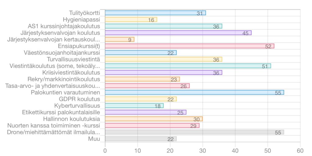 Viiden kärki on selkeä: Jaettu 1. sija: Drone/miehittämättömät ilmailualukset (tästä jo kurssimietintä syksylle) ja Palokuntien varautuminen, 2. sija: Ensiapukurssit, 3. sija Viestintäkoulutus ja 4. sija Järjestyksenvalvojan koulutus.