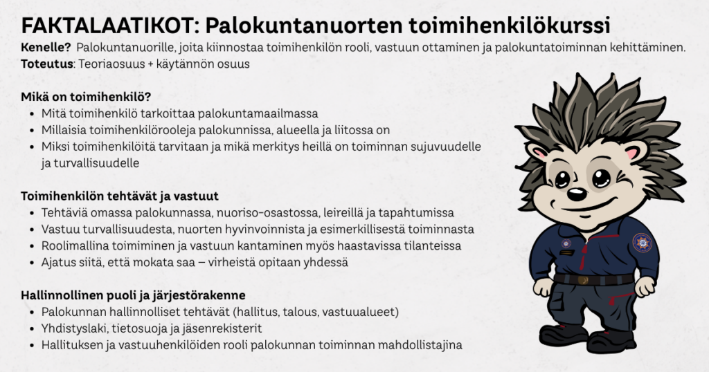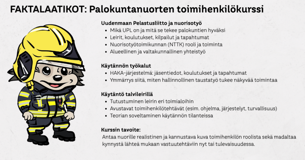 Kahteen osaan jaettu kokonaisuus toimi hienosti: ensin rakennettiin yhteinen ymmärrys ja pohja, sitten syvennettiin osaamista käytännön kautta. Kurssi ei ainoastaan opettanut taitoja, vaan vahvisti myös nuorten itseluottamusta ja tunnetta siitä, että he ovat tärkeä osa palokuntayhteisöä. Monelle osallistujalle toimihenkilökurssi saattoi olla ensimmäinen askel kohti uusia vastuita – ja ehkä jopa tulevia ohjaaja- tai johtotehtäviä.