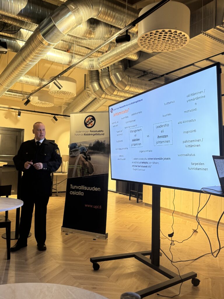 Ennen lounasta Juha Kylmälä, Riihimäen VPK, kertasi edellisen seminaarikerran asioita, mitä puhuimme esimerkiksi ihmisten versus asioiden johtamisesta ja lounaan jälkeen päästiin tämän päivän aiheen pariin. Ennen päivää, seminaarikutsun yhteydessä, palokuntien päällystöille oli laitettu ennakkokysely, jossa kysyttiin, mitä aiheita tänään haluttaisiin käsiteltävän. Ennakkokyselyn vastausten pohjalta Juhalle aiheeksi valikoitui palokunnan strateginen johtaminen.